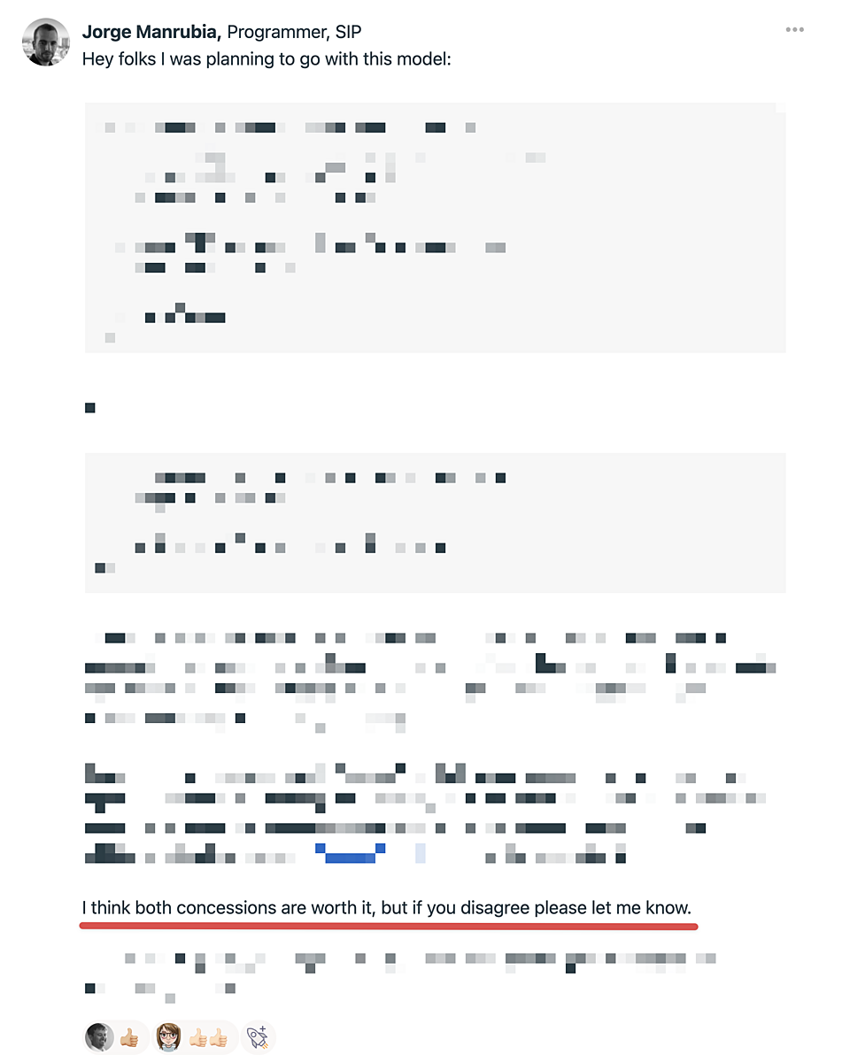 Finally, my favorite is a subtle iteration over the previous one: explain your idea but, instead of asking for validation, involve other people so that they can weigh-in if they feel like it. Doing this is not rocket science, just ask for feedback in a non-blocking way. Here are two recent examples where I did this: